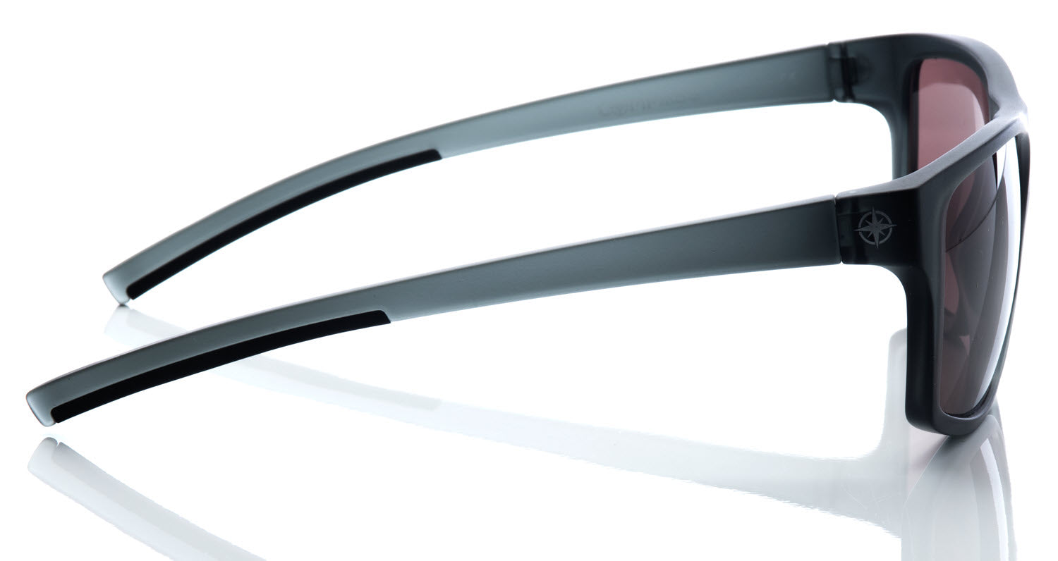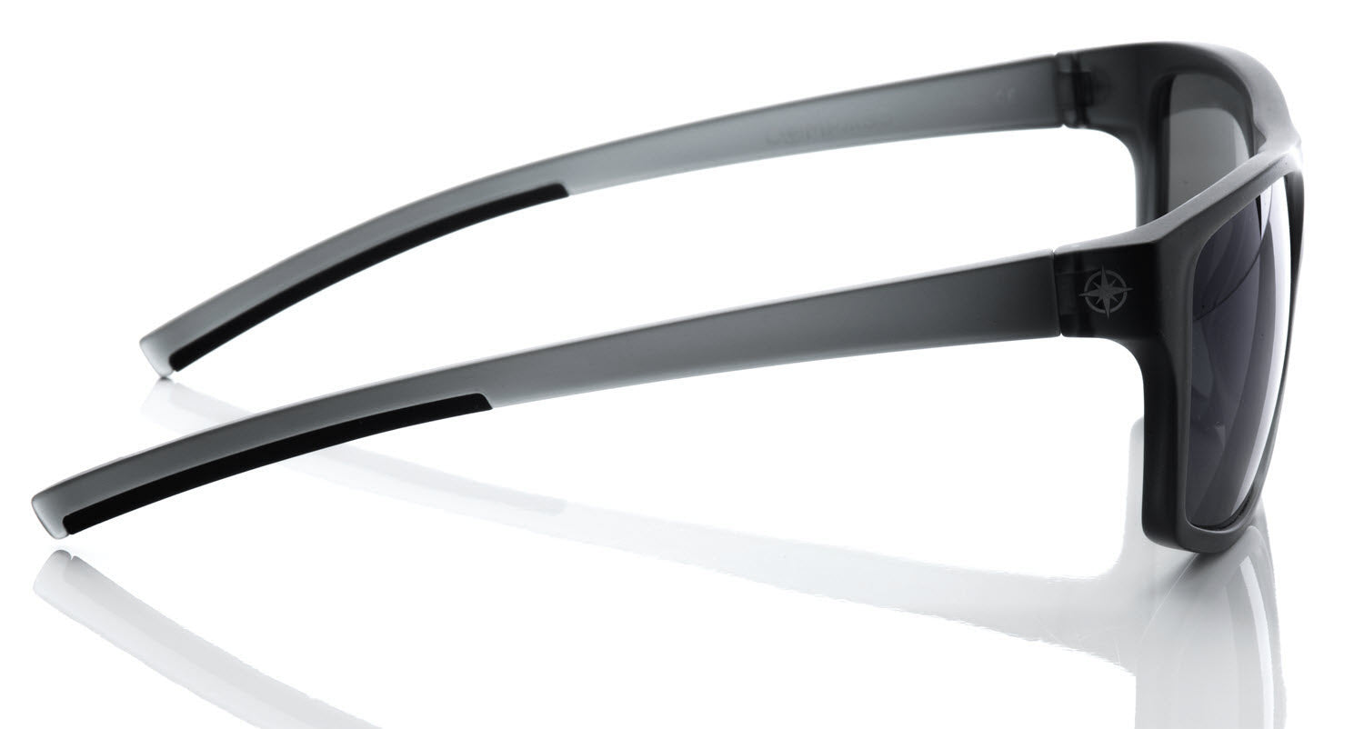 The translucent charcoal black frame is mostly black with grey and translucent highlights.